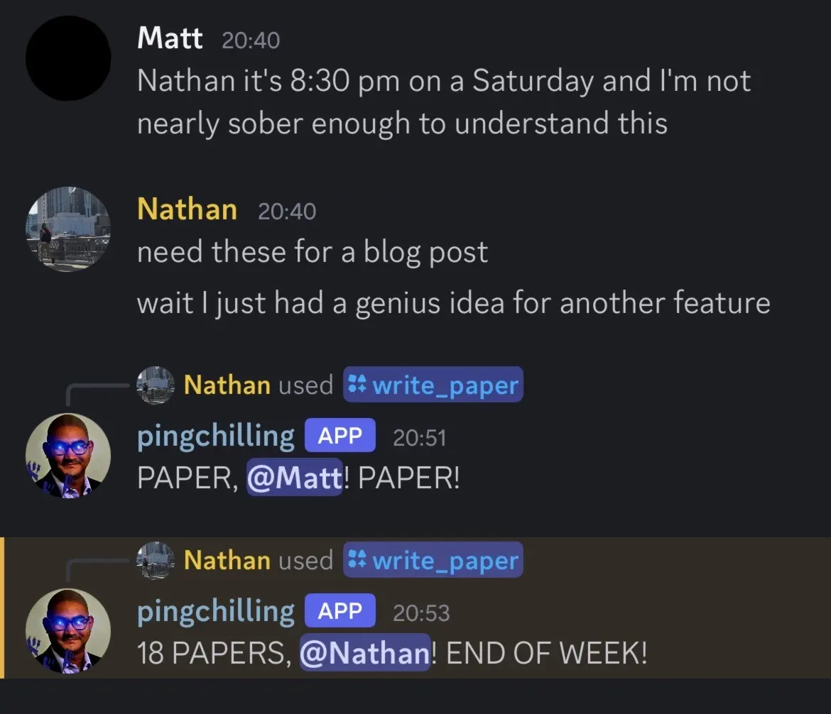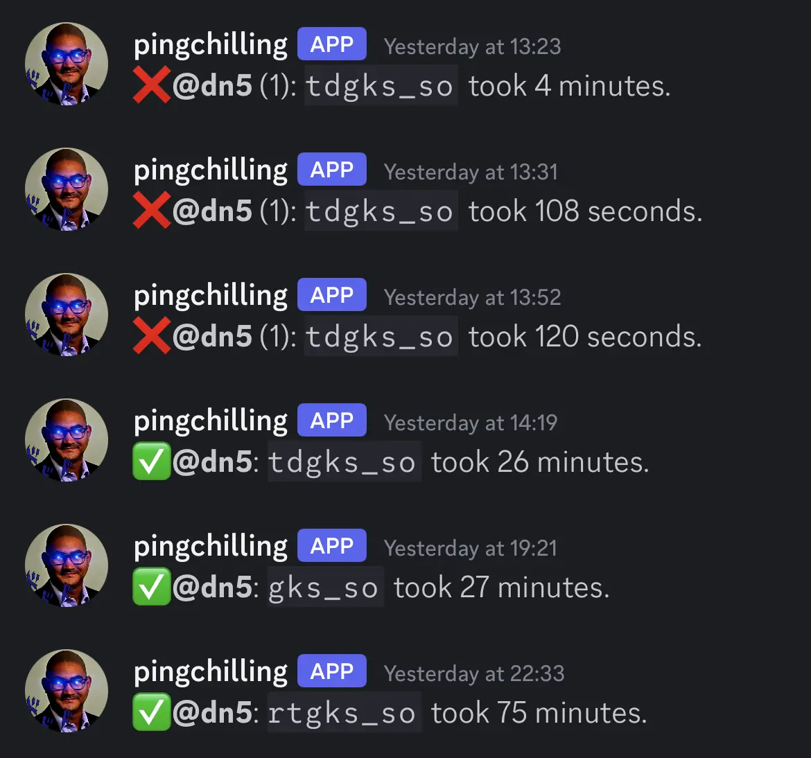 In short, the discord bot reads changes to the .pingchilling file in every user’s directory, every 10 seconds. I leave plenty of room for edge cases like multiple updates happening within 10 seconds, or overflowing the dict of currently running processes… or by creating very large strings to parse through. Now that I think about it, there are an uncountable number of ways to crash my bot if you’re trying. So for insecurity reasons, I won’t be sharing the code.