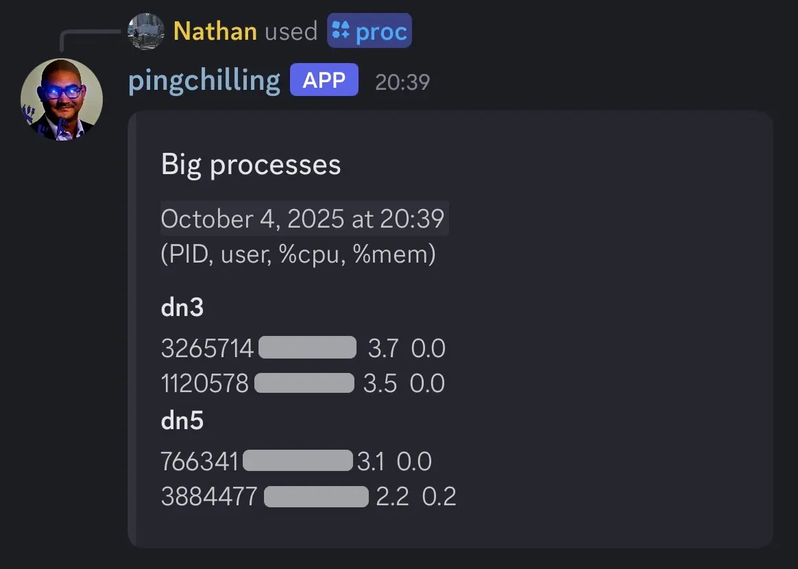 Which gets a table of PID, user, %CPU, and %MEM usage for all processes using more than 2% CPU. That gets saved to another shared file and read by the bot on request. It’s a quick and dirty solution, but it works.